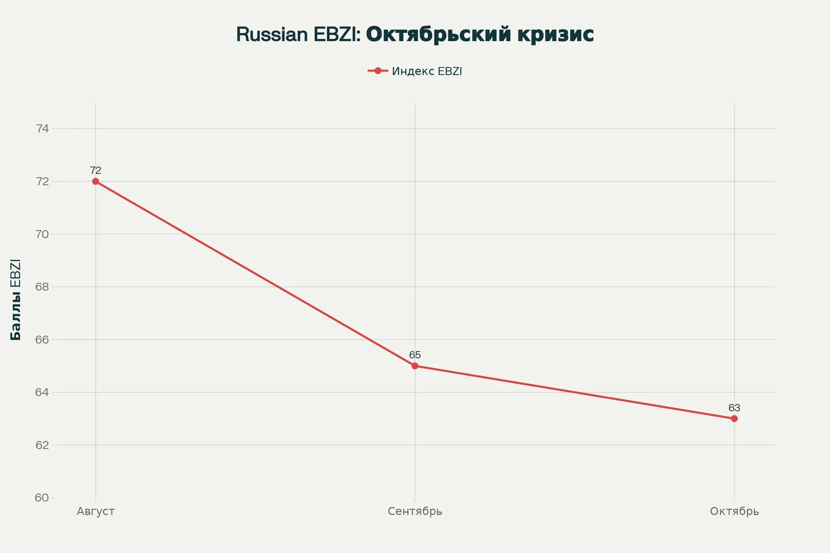Динамика индекса Russian EBZI с августа по октябрь 2025: падение с 72 до 63 баллов.